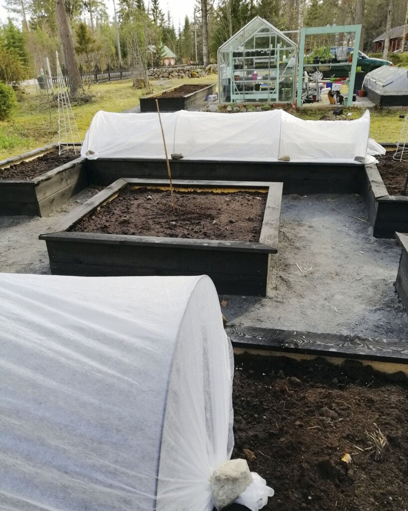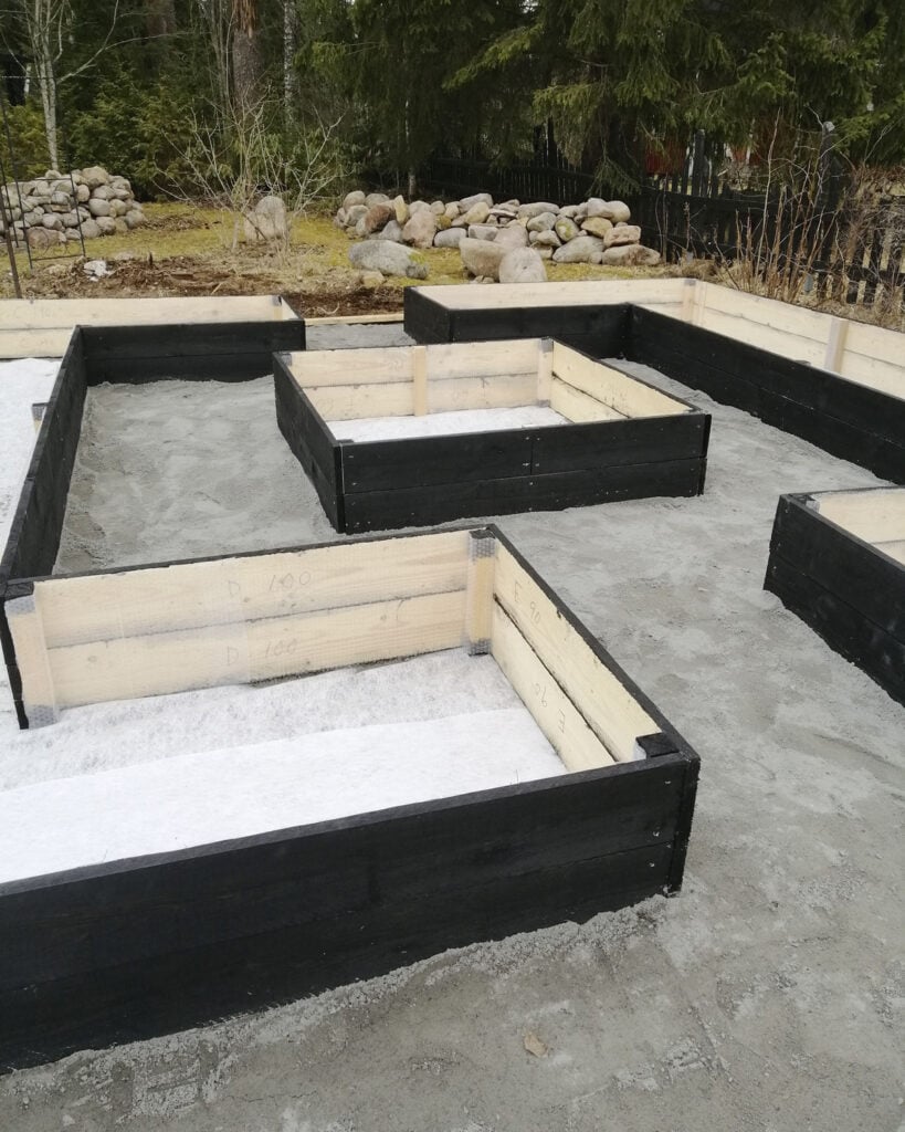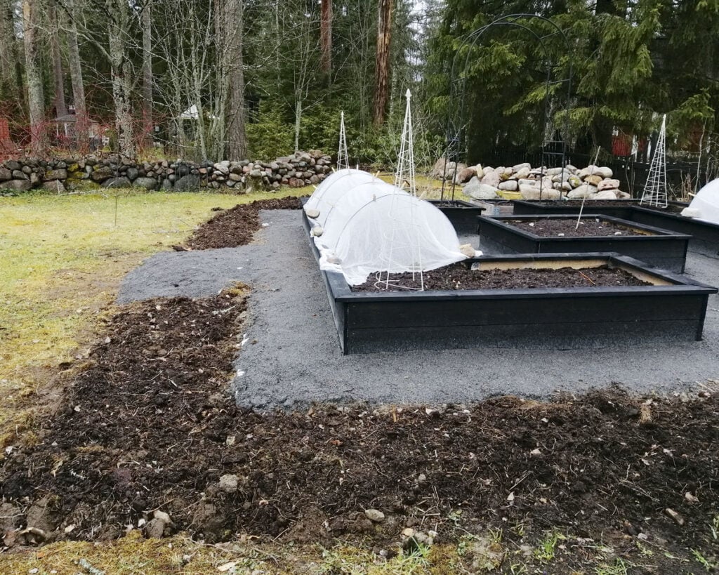 Kun lavat oli koottu paikoilleen, aloitettiin kasvualustan teko. Pohjalle laitettiin kerros tuoretta lantaa sekä koivunlehtiä ja muuta puutarhajätettä. Ylemmäs tuli maatunutta lantaa sekä kompostia, jossa oli mukana mukavasti matoja ja pieneliöitä. Päällimmäiseksi levitettiin kerros pussimultaa.