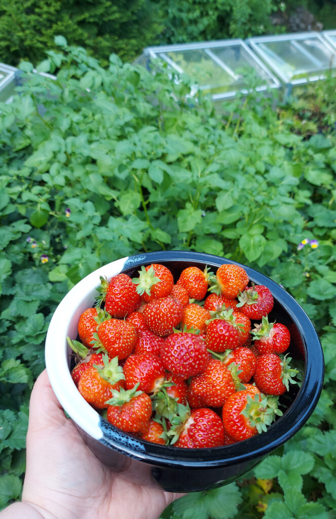 Mansikkamaa antaa vielä viimeisiä, pienempiä mutta makeita ’Polka’-marjoja. Ne piilottelevat lehtien lomassa kuin aarteet, ja maku on ollut makean raikas. Suoraan kallion päälle rakennetun noin 3 x 3 m kokoisen lavan anti on ollut kiitettävää. Keitin juuri 7 purkillista mansikka-raparperihilloa talvivarastoon. Mansikkaa voi laittaa noin 1/3 hilloon ja loput raparperia, silti hillo maistuu ja näyttää aivan mansikkahillolle, jota raparperin hapokkuus täydentää hienosti. Täydellinen makupari!