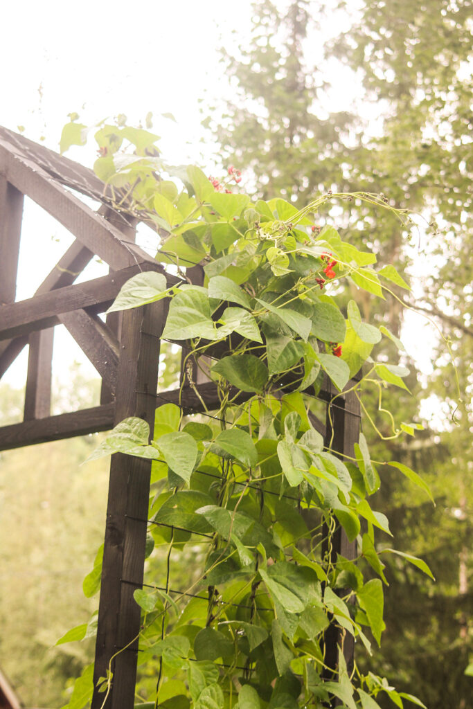 Köynnöstävät ruusupavut kiipeilevät uusia keväällä rakennettuja potagerin portteja pitkin ylväänä, ja niiden kirkkaanpunaiset, valkoiset ja lohenpunaiset kukinnot vetävät puoleensa sekä katseita että pölyttäjiä. Pian on aika hakea tikapuut ja ryhtyä keräämään papusatoa, sillä ruusupapujen palot tulee kerätä nuorena, ennen kuin ne pullistuvat ja muuttuvat koviksi ja pinnaltaan karheiksi.