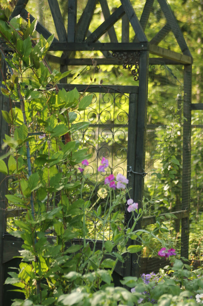 Tuoksuherneet täyttävät juuri nyt ilman hennolla, makealla tuoksullaan. Esikasvatin keväällä erityisen paljon vaaleanliilaa ’Lavender-lajiketta’. Tuoksuherneet kukkivat vielä pitkään, etenkin jos kukintoja kerää ahkerasti silmäniloksi maljakkoon, eikä anna kasvin mennä siemenpalkoja tuottavaan vaiheeseen. Tuoksuherneiden herkkyys on kuin elokuun tunnelma itse – makean kaunis ja silti niin katoavainen.
