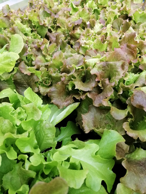 Meheviä retiisejä on mukava poimia.Retiisi on terveellinen kevätherkku.Taustalla kasvaa tummalehtistä italialaista bataviansalaattia ja etualalla lehtisalaattisekoitusta.Tiheään kylvettyä salaattia on hyvä harventaa reippaasti lautaselle jotta kasvusto ei ala kosteassa mädäntymään.Retiisien taustalla tillit kasvussa. Pian niitäkin voi harventaa ja silputa salaattikastikkeen tai perunoiden mausteeksi.