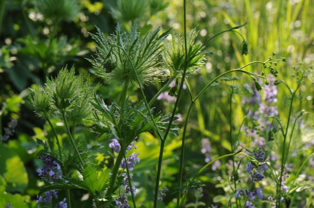 Paahteisessa kukkapenkissä alkavat alppipiikkiputket kohta sinertyä, mirrinminttu jo kukkii sinisenä. Niille avautuu kohta valkoinen vierustoveri, sillä annan pukinjuuren (Pimpinella saxifraga) kasvaa siellä missä haluaa. Se on niin kaunis kukkanen, kuin pieni valkea pitsiliina.