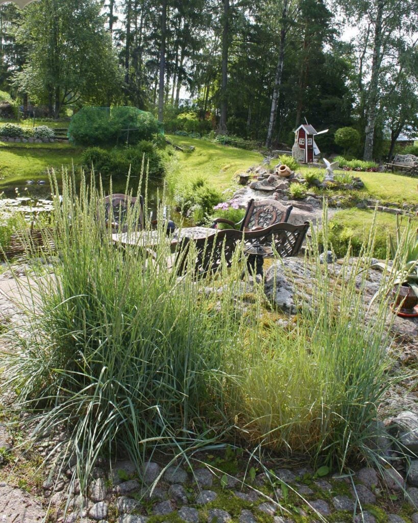 Mänttä-Vilppulassa sijaitseva järvenrantapiha on valtavan monipuolinen. Näkymä on säilynyt levollisena kookkaiden kasviryhmien ja oivaltavasti piilotettujen tilojen ansiosta.