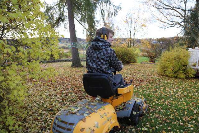 – Maalla oppii ja konetyöt ovat tuttuja, työ opettaa lisää. Lehtien haravointi vaatii pitkäjänteisyyttä, mutta kun kuulokkeista tulee musiikkia, jaksaa vaikka kuinka pitkään.