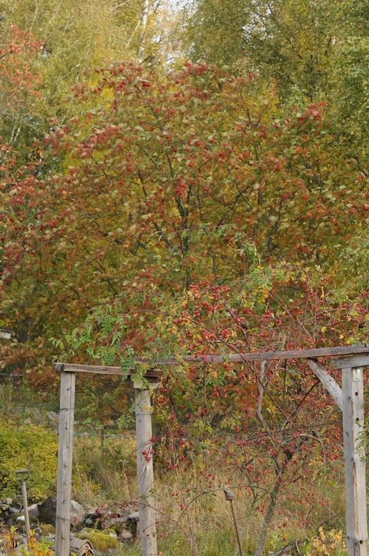 Orjanruusu voi tehdä syksylläkin muutaman kukan, mutta nyt sen koristearvo on kirkkaanpunaisissa, pitkulaisissa kiulukoissa. Ruotsiksi orjanruusu on nyponros eli ”kiulukkaruusu”, johtuisiko jokavuotisen runsaasta määrästä kiulukoita, joita voi käyttää ravinnoksi. Olen jonakin vuonna tehnyt niistä hyytelöä yhdessä pihlajanmarjojen kanssa, pihlaja näkyykin kuvassa taustalla.