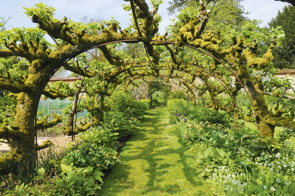 Viileitä sävyjä löytyy keittiötarhasta laajemminkin. Hedelmäpuutunneleiden alla kukkivat pastellisävyiset tulppaanit ja imikät. Valkokukkaiset sinililjat, laukat ja kurjenmiekat loistavat sammaleisia hedelmäpuunrunkoja vasten. Tässä puutarhassa ei sammalta ja jäkälää harjata omenapuiden rungoilta, sillä linnut napsivat niistä hyönteisiä ravinnokseen.