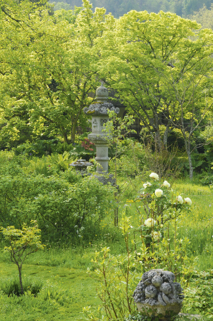 alaisia, joten niistä ei ole riesaa. Kasvit kukoistavat lauhassa ilmastossa lähellä etelärannikkoa: jättigunnerat, magnoliat, kameliat ja sinisateet. Viimemainitut ovat toukokuussa kukassa jokaisessa rakennelmassa ja sillankaiteessa, joita tilalta löytyy.