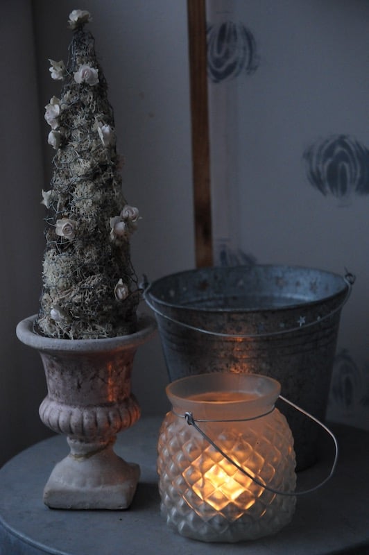 Joulukuusi on tehty katiskaverkosta pyöräytettyyn suppiloon sullotusta jäkälästä. Hempeän vaaleanpunainen ruukku ja ruusukoristelu eivät ole niin jouluisia, etteikö tuota voi muinakin vuodenaikoina katsella.