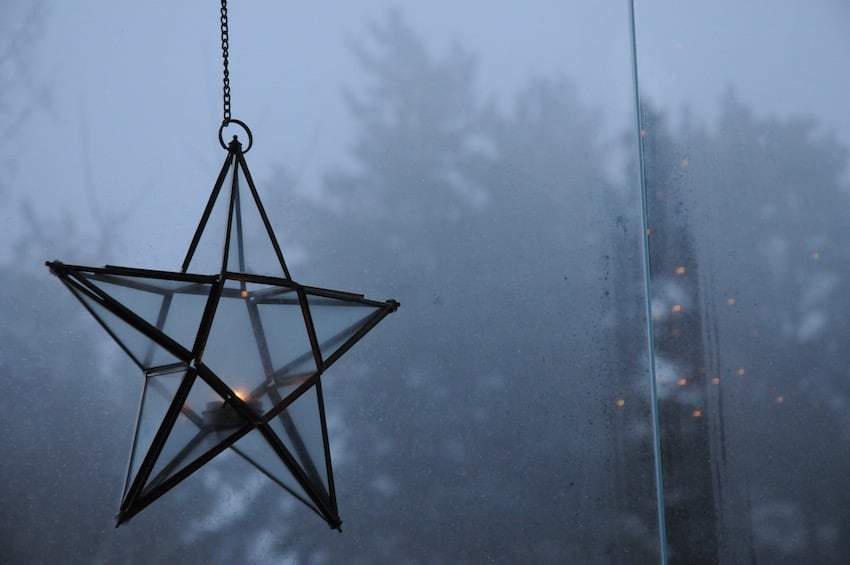 Kaunis valaistus on tärkeää. Ripustan valosarjat amppeliin, joka olisi muuten virattomana talvikauden. Tuossa on kaksi erilaista sarjaa, joista siniset sydämet oli aikanaan virheostos – luulin sen olevan väriltään valkoinen – mutta oikeastaan siniset valopisteet luovat tuhannen ja yhden yön tunnelmaa juuri tuossa itämaishenkisessä amppelissa.