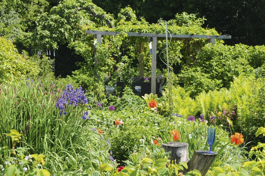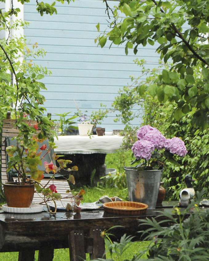 Rehevä keidas siirtolapuutarhatyyliin. Viehkon vehmauden keskellä, villiviinipergolan alla, voi aivan unohtaa olevansa kaupungin vilinän tuntumassa.