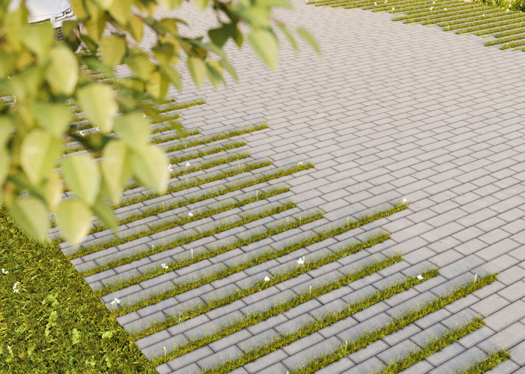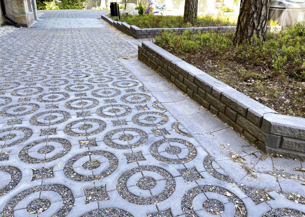 Golf-nurmikiveys on samaan aikaan kova, kestävä ja vihreä pinta. Jos kulutus on vähäistä, tämän käytävän reunat näyttävät nurmikolta muutaman vuoden päästä, mutta pinta ei painu, jos siihen ajetaan autolla.