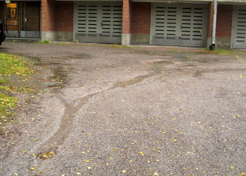 Reunakivi ohjaa hulevedet kaivoon. Liimattava reunakivi kiinnitetään asfalttiin kiven pohjalla olevalla bitumilla, joka lämmitetään kiinnityksen yhteydessä. Tällaiset reunakivet irtoavat helposti lumenaurauksessa, jos asfaltin reunaa ei ole merkitty hyvin. Graniittinen, upotettava reunakivi tuo ryhtiä pihaan. Kaarnalaatan pinta muistuttaa puun kaarnaa. Luonnonläheisyys ja käytännöllisyys kohtaavat. Kuva Lakan Betoni Lumo-Kartanokivellä voi rakentaa pintoja, jotka ovat sekä kovia ja kestäviä että läpäiseviä. Kuva Rudus Riimukivellä syntyy mielenkiintoisia kuvioita. Kuva Rudus Luotokivi sopii moneen paikkaan. Kuva Rudus Kivituhkapintaan syntyy lätäköitä ja uria sadesäällä, jos pinnan tasauksessa ja hulevesikaivojen sijoituksessa on virheitä. Kivituhkapinta ja vesikourut vaativat huoltoa vuosittain. Reunuksen liuskekivien väleissä on saumausainetta. Saumoihin ei kasva mitään, mutta vesikään ei imeydy. Kun mukulakivet saumataan betonilla, kuten kuvassa, pinta ei läpäise vettä lainkaan. Mukulakivet voivat olla niin rautapitoisia, että niistä tulee ruosteväriä kiveyksen pintaan. Louhikivi on betonikivi, joka jäljittelee mukulakiveyksen ulkonäköä. Louhikivi sopii esimerkiksi rakennuksen sokkelin viereen sepelin tilalle, terassille, kulkuväylien pinnaksi tai parkkipaikalle. Leveiden saumojen ansiosta kiveys läpäisee vettä. Golfkivien leveissä saumoissa kasvaa nurmikko. Hulevesi imeytyy paremmin kuin kiveyksellä, jonka saumat ovat kapeita. Epäonnistunut asfaltti on vaikea korjata. Jää pieni lätäkkö, kun hulevesi ei pysty valumaan pois.