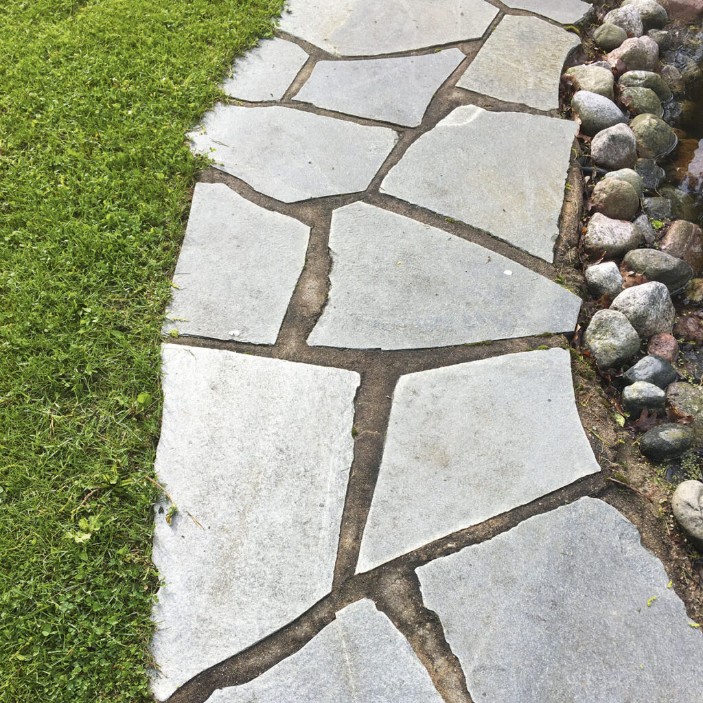 Askelmakivipolku liuskekivistä on edullinen, toimiva ja kaunis ratkaisu. Kivien väliin kasvaa sammalta ja heinää vuosien mittaan.