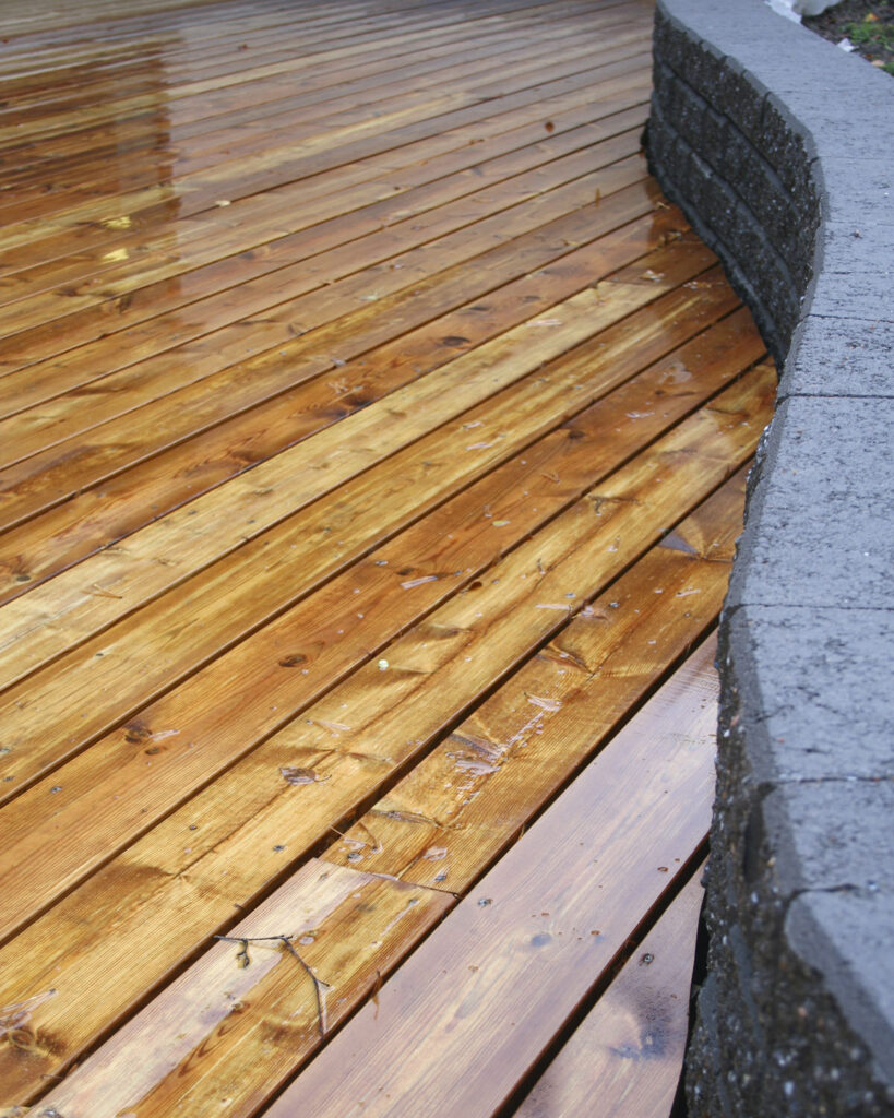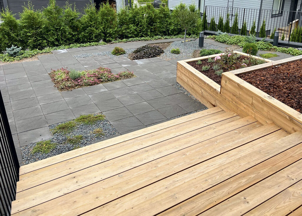 Mukulakiveys puuterassin ympärillä on kaunis ja helpottaa nurmikon leikkaamista terassin vierestä.