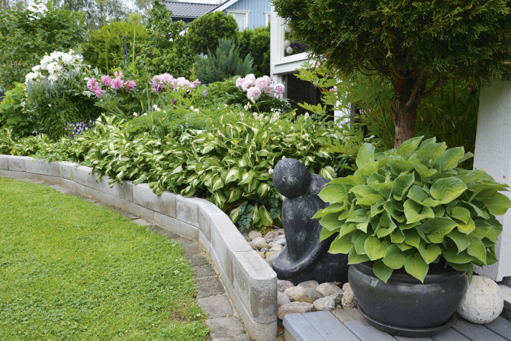 Reunakivet kehystävät kohopenkin, jonka multavassa kasvualustassa kuunliljat ja pionit viihtyvät.