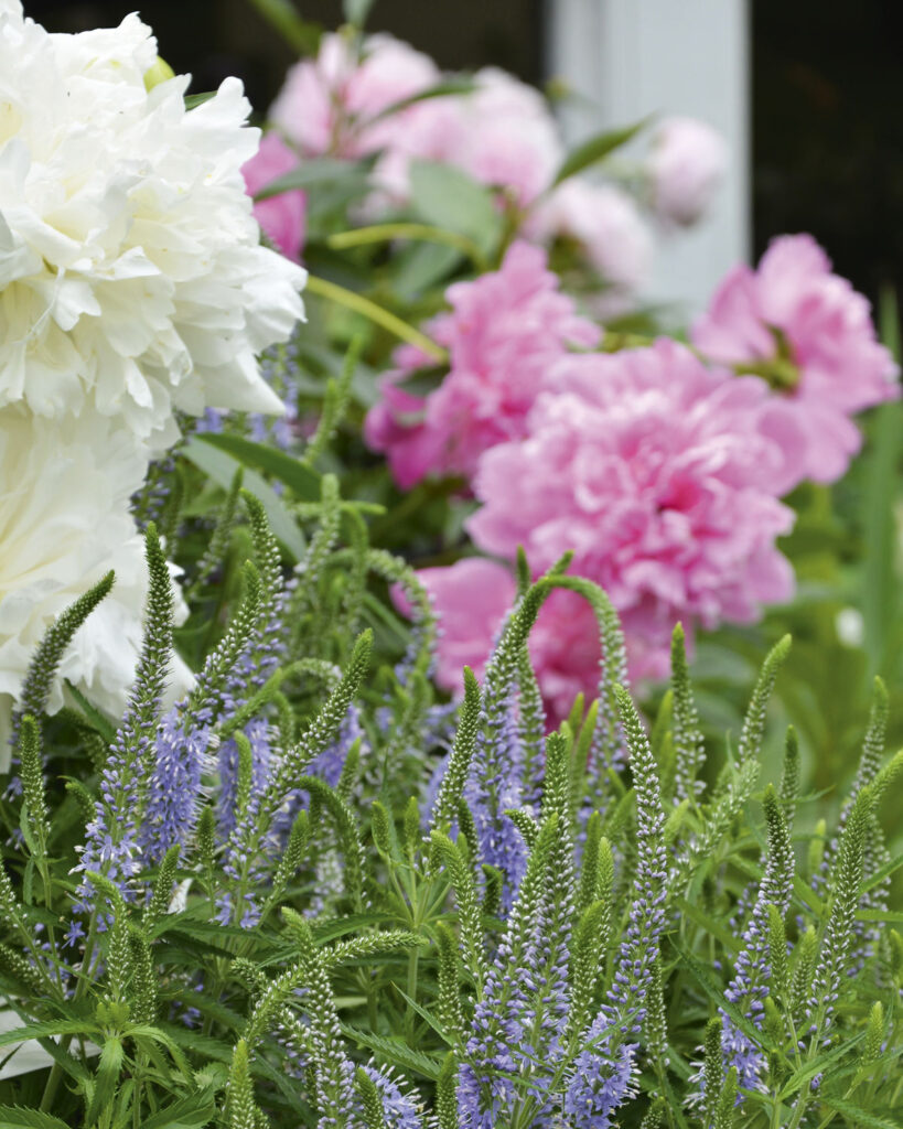 Sinikukintoinen tähkätädyke (Veronica spicata) ja pionit (Paeonia) viihtyvät aurinkoisella paikalla. Tähkätädykettä tavataan luonnossa lähinnä Ahvenanmaan kuivilla kedoilla, mutta se menestyy myös puutarhakasvina.
