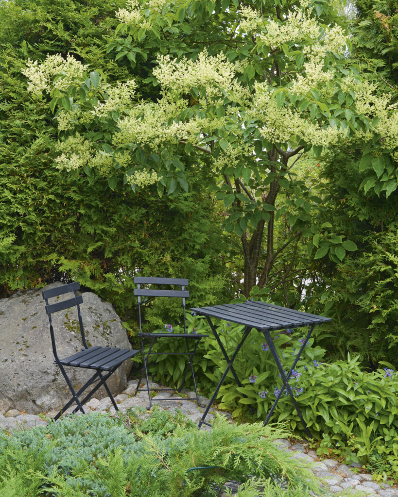 Ystävältä saatu japaninlikusterisyreeni on sen sijaan parhaimmillaan, sillä se aloittelee kermanvalkoista kukintaansa. Pensaan oksat nousevat korkealle ja kurkottelevat niin laajalle, että tuoksuvan latvuston alla pariskunta nauttii nykyään aamukahvinsa.