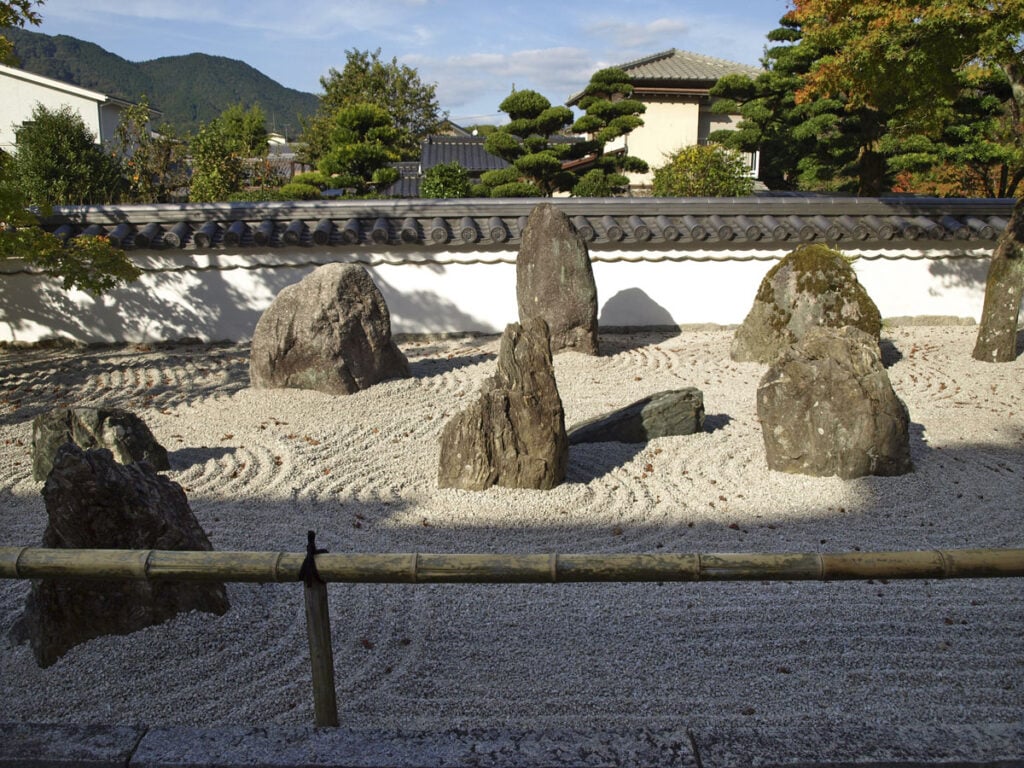 Temppelin etupihalla oleva kolmeen osaan jaettu hiekkapuutarha, Bukkō-seki-tei, on reunustettu matalin bambuaidoin. Vaalea, soramainen hiekka on haravoitu säännönmukaisin vedoin. Länsimaissa tällaista puutarhaa kutsuttaisiin zen-puutarhaksi, mutta Japanissa puhutaan kuivasta maisemapuutarhasta, karesansui. Vaakasuorat raidat sekä kivien ja puiden ympärillä olevat rinkulat tuovat mieleen veden liikkeen: on kuin kivi olisi pisaran lailla pudonnut hiekkamereen ja laittanut sen liikkeeseen. Vaikka ruska antaa vielä odottaa, on jostakin lentänyt punertuneita lehtiä, jotka ovat asettuneet hiekan vakoihin kuin varta vasten aseteltuina. Maisema jatkuu muurin toisella puolella siintävinä vuorina.