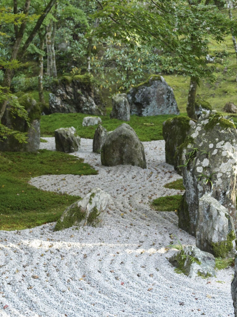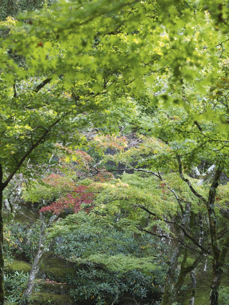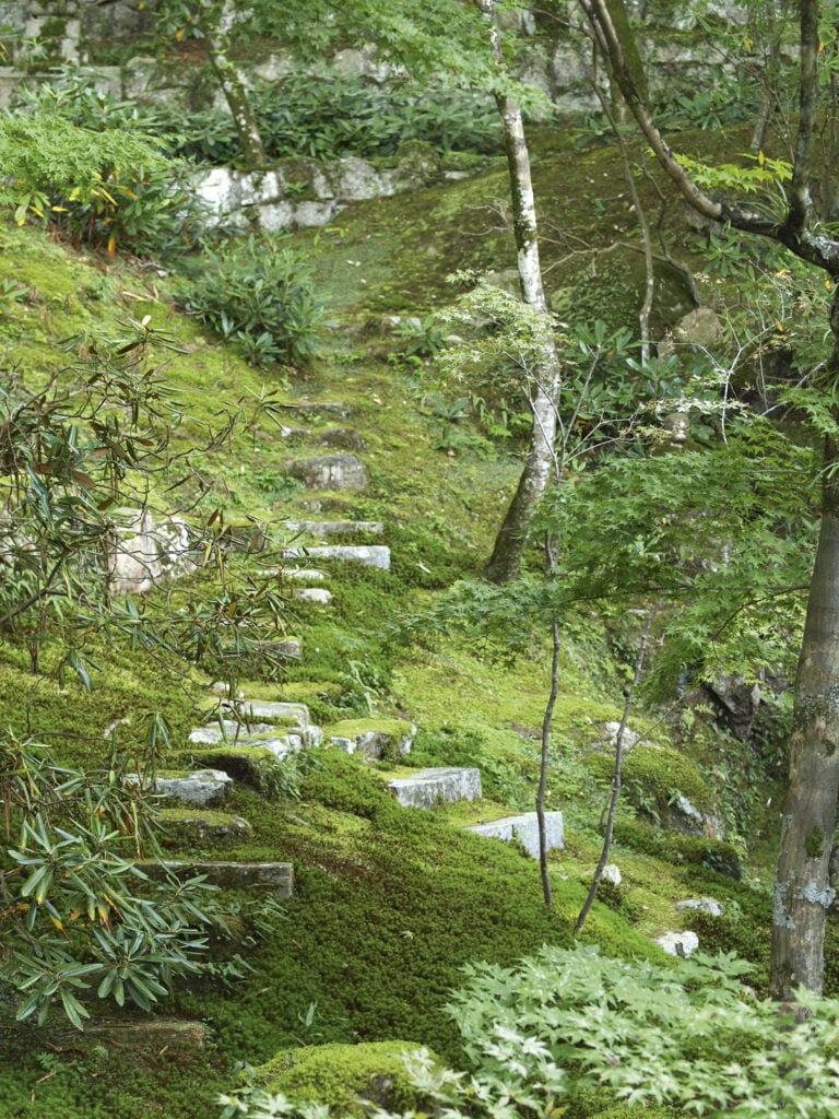 Tässä puutarhassa ei käyskennellä, se on tehty etäältä ihailtavaksi. Puiden ja sammalen välissä kulkee hiekasta muodostettu puro, kiviset portaat johdattavat katsetta jyrkännettä ylös. Sinne tänne on sijoitettu kiviä ja buddhapatsaita, jotka tuntuvat sulautuvan maisemaan. Väreistä pitävät huolen kukkivat pensaat ja ruska. Keväällä alppiruusut värjäävät näkymän violetiksi, marraskuun puolivälissä on japaninvaahteroiden tummanpunaisten sävyjen vuoro. Nyt ruska antaa itsestään vain pientä vihiä, sen sijaan vihreys on vangitsevaa. Valokaan ei häikäise vaan siivilöityy kauniisti puiden lehvästön läpi.