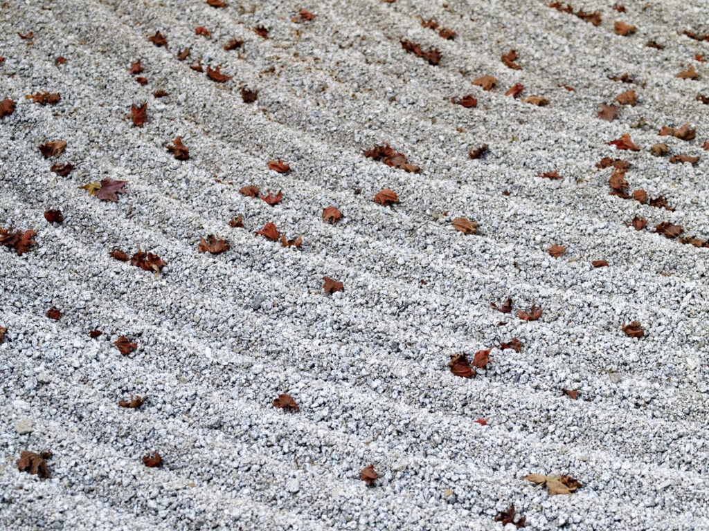 Ennen kuin jätämme temppelin puutarhoineen, kysyn vielä munkilta, haravoivatko he hiekka-alueet joka päivä. Ei, ei toki, hän virnistää. Vain silloin, kun tuuli ja sade ovat sekoittaneet kuvion tai jos joku on mennyt astumaan hiekalle. Nyt ymmärrän matalien bambuaitojen merkityksen, hiekkaa tekee tosiaan mieli koskettaa – ja eiköhän joku länttäisi siihen jalanjälkensäkin, tahallaan tai tahattomasti.