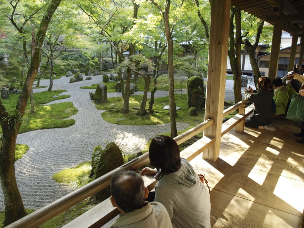 Sammalpuutarhan maagista maisemaa katsellessa mieli rauhoittuu, ei ole enää minnekään kiire. Japanilaisetkin, jotka usein rientävät nähtävyydeltä toiselle, istuvat puisella terassilla pitkään, hiljaisina, antaen puutarhan kauneuden imeytyä itseensä. Ovella seisoo kaksi keski-ikäistä naista, jotka juttelevat matalalla äänellä. Toinen heistä kertoo vierailleensa temppelillä aiemmin ja ihmetelleensä, miksi ihmiset ottivat kuvia tatamimatosta. Syy selvisi pian: puutarhan läpi tunkeva valo oli värjännyt ne vihreiksi!