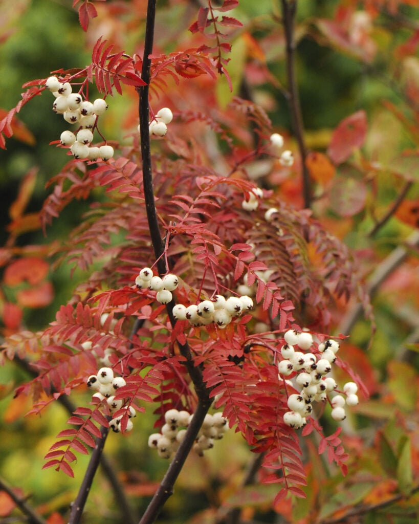Pilvihelmipihlaja (Sorbus frutescens) on herkullisen värinen syksyllä, kun lehdet menevät tummanpunaisiksi ja marjat ovat valkoiset.