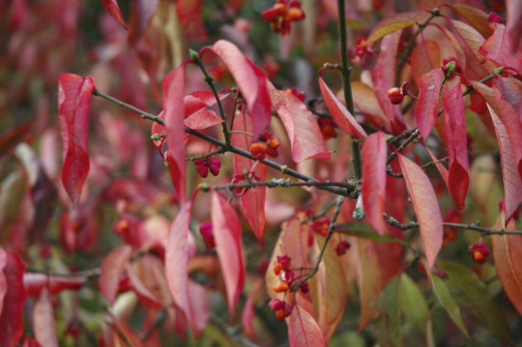 Kirsikkasorvarinpensaan (Euonymus planipes) tähtihetki on syksyllä, kun lehdet saavat syysvärin ja hedelmät avautuvat kuin kukat.