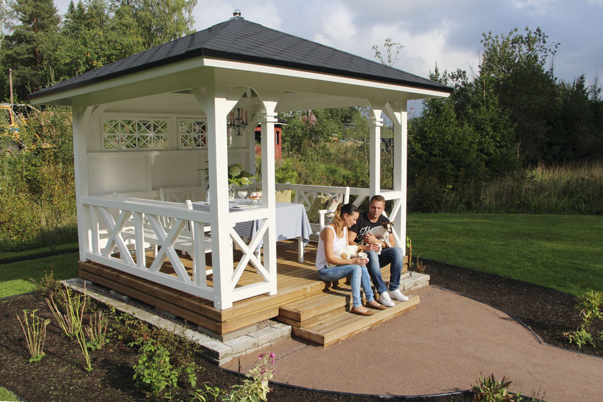 Mennyttä aikaa huokuva huvimaja oli Jonin loppukesän projekti ja on saamassa istutukset ympärilleen. Huvimajan yksityiskohdat, kuten pilareiden yläkoristeet, pariskunta suunnitteli yhdessä ja Joni toteutti ne.