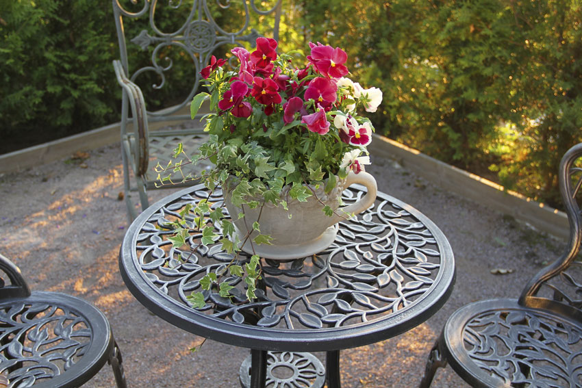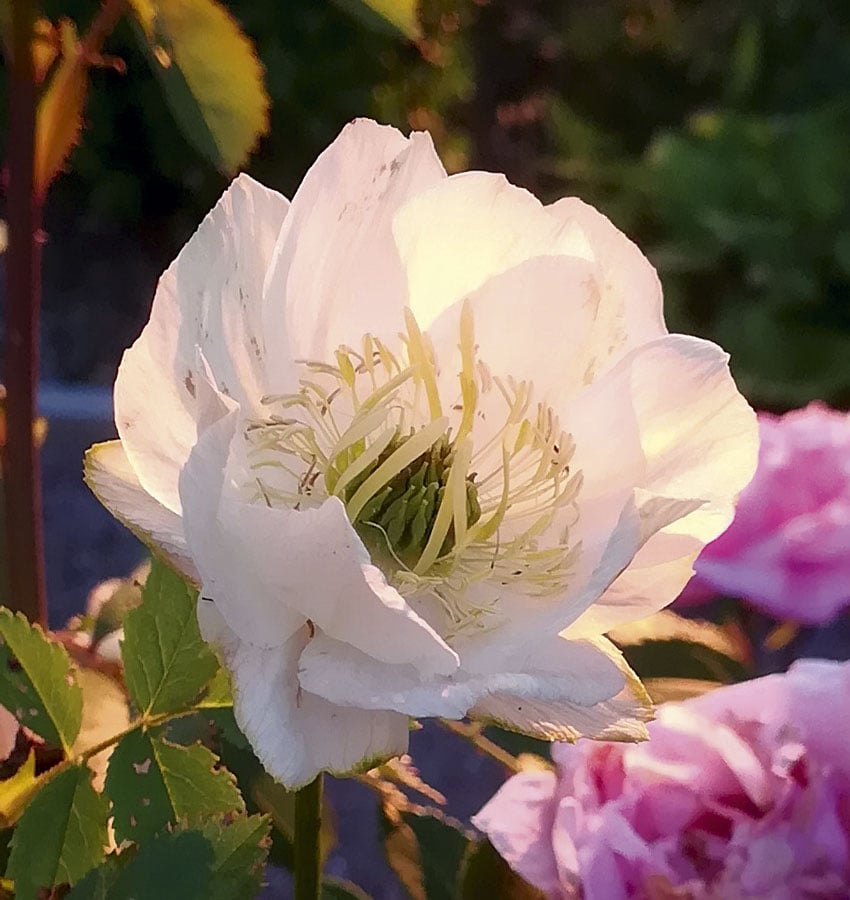 Puutarhan tunnelma muuttuu lempeäksi ilta-auringon pehmeässä syleilyssä.