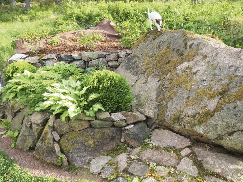Loiva rinne on jo osittain saanut luonnonkivistä tukimuurin ja kasvit reilun multatilan muurin takaa.