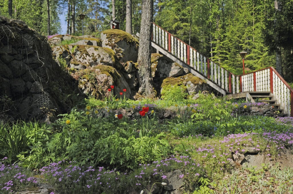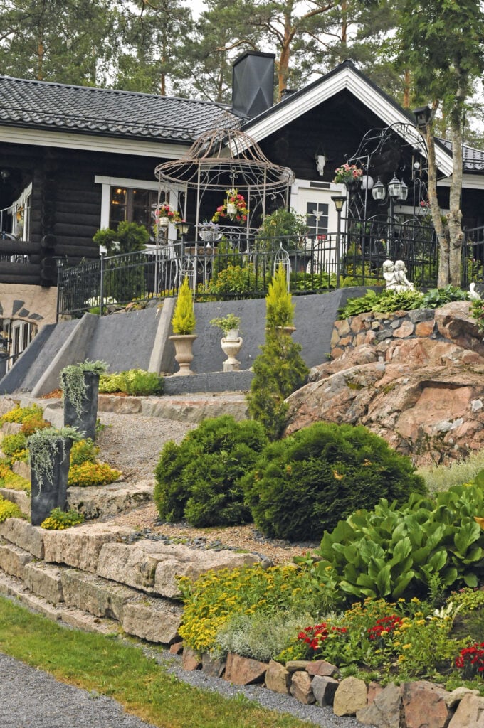 Olavi Niemen pihassa kalliolle johtavat talon tyylin ja värityksen mukaiset portaat. Niemet rakensivat kallion jatkeeksi lohkaremuurin käsivoimin, vaikka räjäytysurakoitsija pyöritteli päätään ajatukselle. Muurin pinnassa on verkko köynnösten kiipeämistä varten.