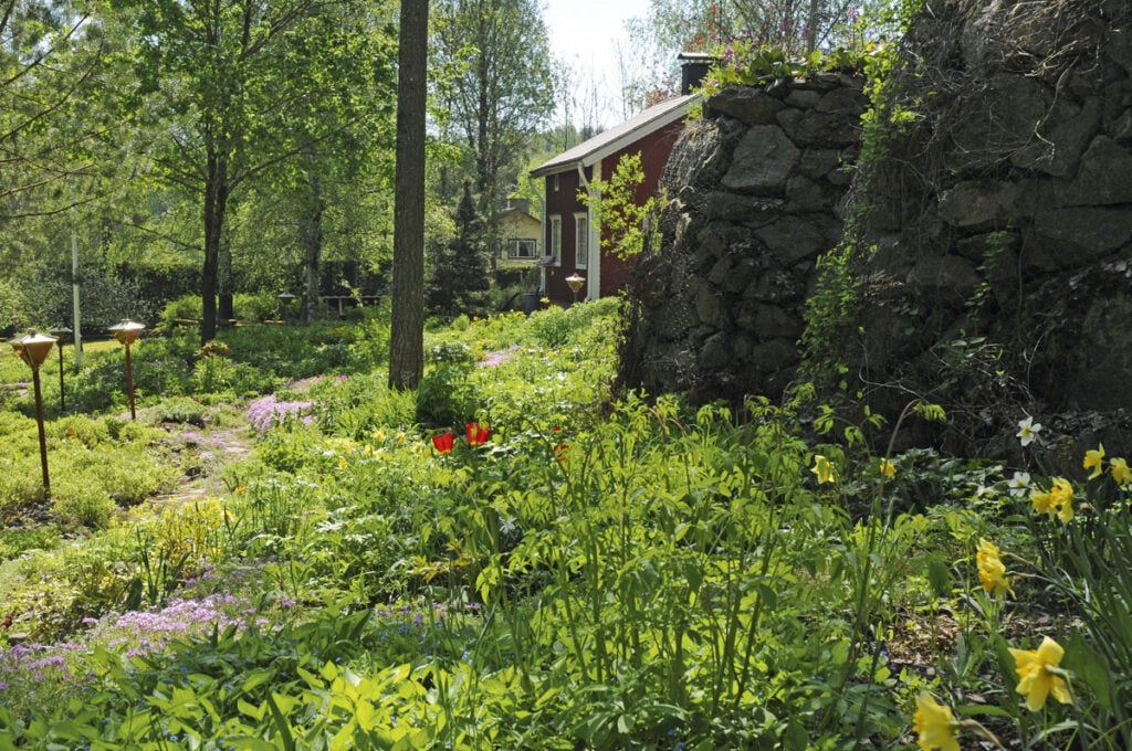 Auli Södermanin piha Houtskarissa on suurimmaksi osaksi meren sileäksi hiomaa kalliota. Suuri osa istutuksista on tehty kallionkoloihin. Kasvien täytyy kestää kuivuutta, vuorenkilpi on yksi luotettavimmista. Kesäkukat kukkivat ruukuissa tasaisissa kohdissa.