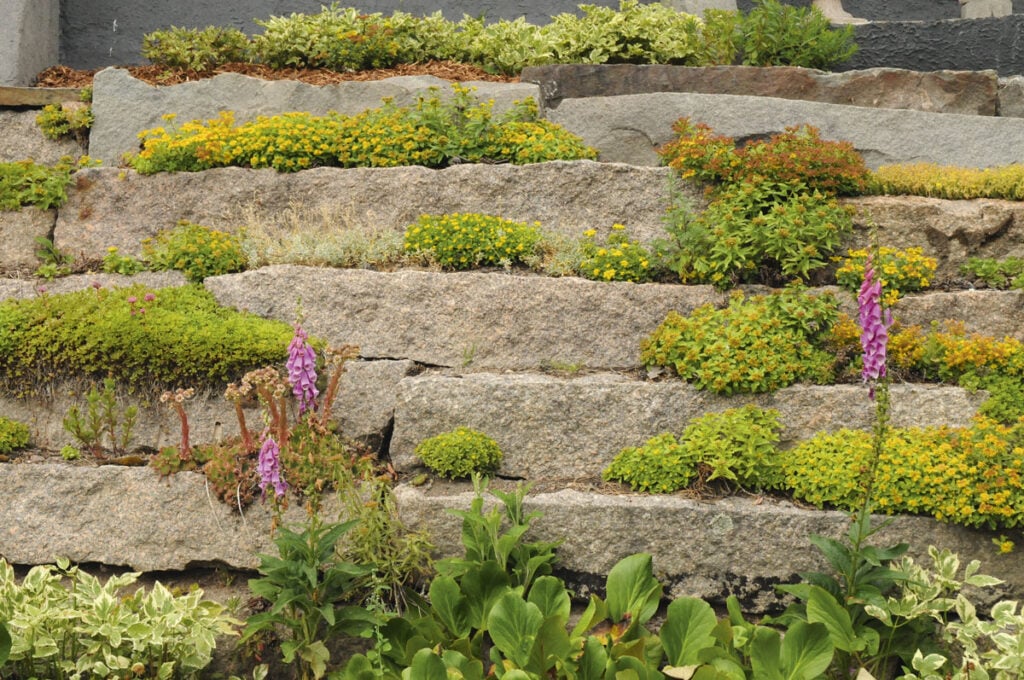 Seija Helmisen piha nousee kohti taloa Nokialla. Rinne on kivinen, mutta Seija on saanut sen kukoistamaan istuttamalla kivien väleihin luotettavia, helposti leviäviä kasveja. Haastavimmissa paikoissa, joihin on vaikea päästä hoitamaan istutuksia, kasvaa nopeasti leviäviä maanpeittokasveja ja koristeheiniä, kuten viiruhelpiä (Phalaris arundinacea 'Picta') ja viiltosaraa (Carex acuta).