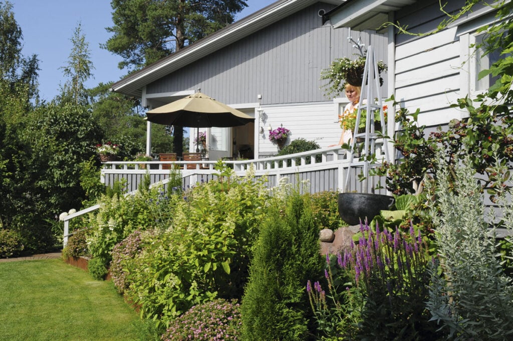 Suurta korkeuseroa pehmentävät rehevät tuija- ja hortensiaistutukset Himasten pihalla.