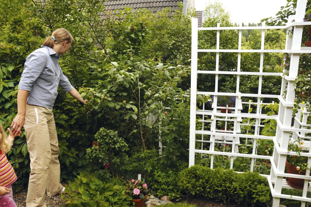 Pieni tila haluttiin hyödyntää mahdollisimman tarkkaan niin alas- kuin ylöspäin. Laatikoihin rakennettiin polveilevia köynnössäleikköjä, joiden syvennyksiin saatiin myös hyllyjä ruukkukasveille. Säleikköjen ja niihin kiipeilevien köynnösten avulla pienelle takapihalle tuli samalla yksityisyyttä.