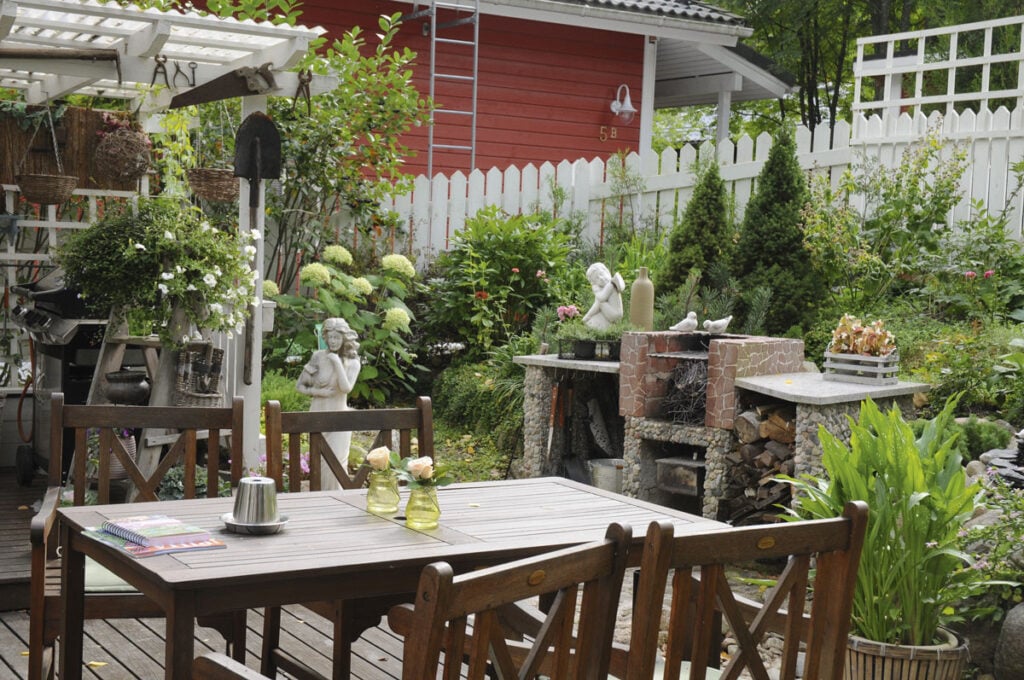 Mia Hakalaxin viihtyisä etupiha on koverrettu rinteeseen. Istutukset ovat korkealla tukimuurin päällä. Myös grillin on Mia muurannut itse.