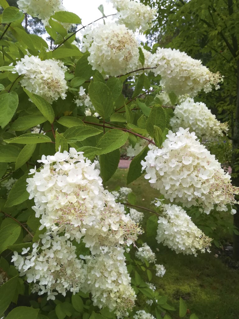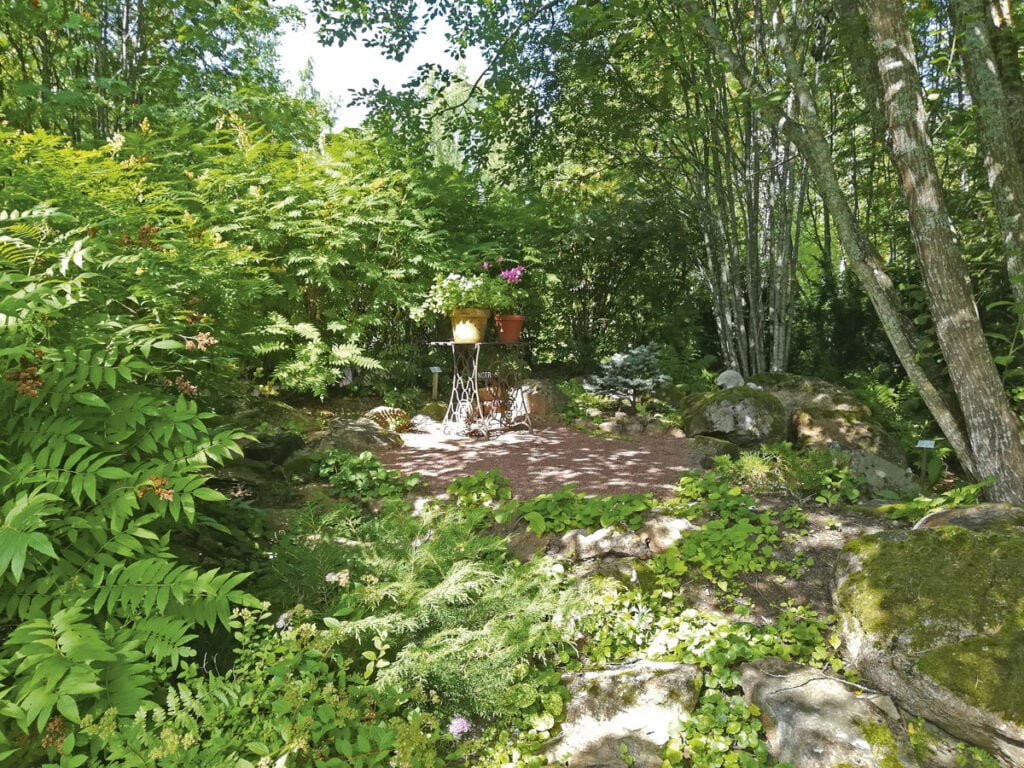 Suurten puiden suoma katve luo otolliset olot lehteville varjopaikan perennoille ja happaman maan alppiruusuille. Vaaleat kukat ja lehdet ovat varjopuutarhan valopilkkuja.