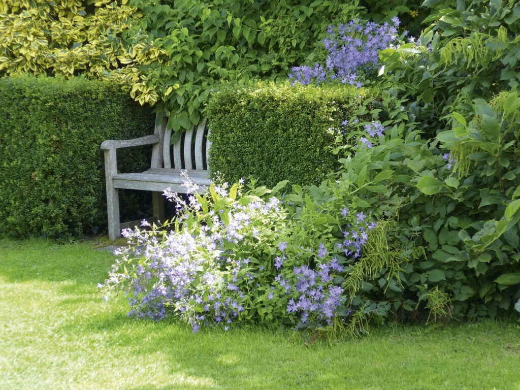 Kevyempää suojaa saadaan köynnöksillä, joista kärhöt (Clematis) ovat yhtenä hyvänä vaihtoehtona. Kuutamo- ja mustilanhortensia ovat näyttäviä ja helppohoitoisia pensaita. Ne antavat hyvän suojan aina 2,5 metriin asti. Kuutamohortensia (Hydrangea paniculata 'Praecox'), vyöhykkeet I–IV(V). Mustilanhortensia (H. paniculata 'Mustila'), vyöhykkeet I–V. Japaninmarjakuusiaidan (Taxus cuspidata) kätkössä lampi viilentää puutarhan tunnelmaa. Puoliksi avoin rustiikkinen puuportti yksityisyyteen on vallan viehättävä. Kevyt metalliportti houkuttelee kurkistamaan peremmälle. Penkki sijoitetaan suojaisaan ja rauhalliseen paikkaan, istujan katse kauneinta näkymää kohti. Katseenvangitsijaksi valitaan tietysti se, mikä itseä parhaiten puhuttelee. Pelkistetystä tyylistä pitävän salainen puutarha voi näyttää tältä. Pihlaja-angervojen (Sorbaria sorbifolia) kätkössä. Monirunkoisen raidan (Salix caprea) alla on pieni salainen keidas. Muhkea graniittikivinen muuri sulkee sisälleen kahvittelupaikan. Umpinainen ovi herättää ulkopuolisen mielenkiinnon, mutta on selkeä viesti paikan yksityisyydestä. Salaperäistä tunnelmaa saa myös lavastamalla, tekemällä oven joka ei johda mihinkään. Salaiseen puutarhaan kuljetaan viehättävää polkua pitkin. Rinnepuutarhassa portaat auttavat kulkijaa.