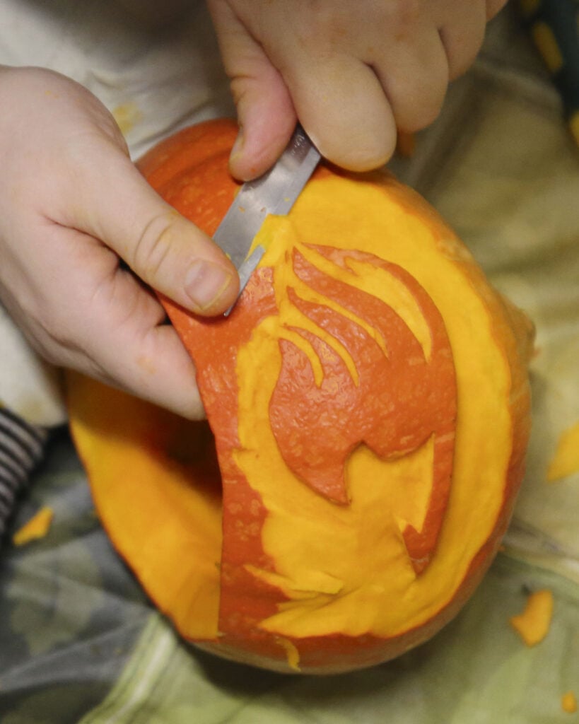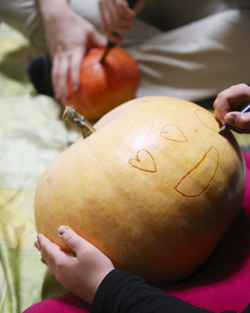 Piirrä kuvio ensin paperille. Valmiin kuvion voi siirtää kurpitsaan kiinnittämällä paperi kurpitsan päälle ja merkitsemällä ääriviivat nuppineulan avulla paperin läpi.