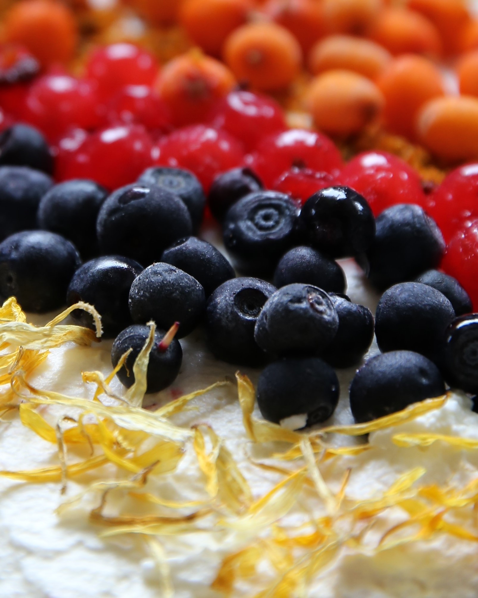 Havtornsbär, havtornskross och torkade ringblomskronblad.Torkade ringblomskronblad, blåbär, röda vinbär och havtorn.