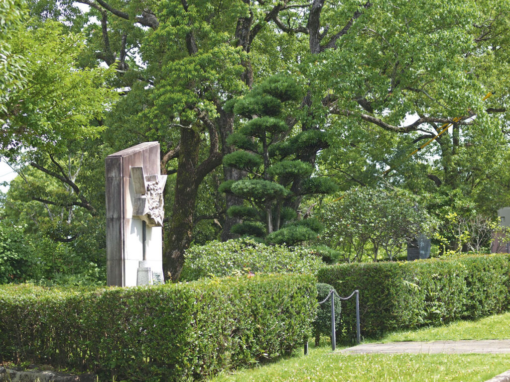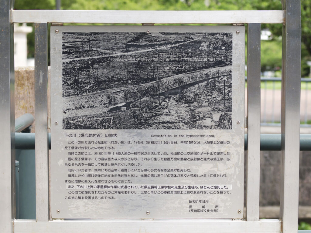 Joen toisella puolella, kamferipuiden, japaninvaahteroiden ja kirsikoiden ympäröimässä Hyposentrin puistossa on pommin räjähdyspiste, jonka keskellä olevaan mustaan sarkofagiin lasketaan vuosittaisessa muistoseremoniassa kuluneen vuoden aikana kuolleiden atomipommin uhrien, hibakushien, nimet. Nagasaki ei ollut varsinainen sotilaskohde, ja suurin osa uhreista oli naisia, lapsia ja vanhuksia. Käsivarsillaan elotonta lasta kantavaa äitiä kuvaavan patsaan jalustaan on kirjattu päivämäärä 9.8.1945 ja kellonaika 11.02.