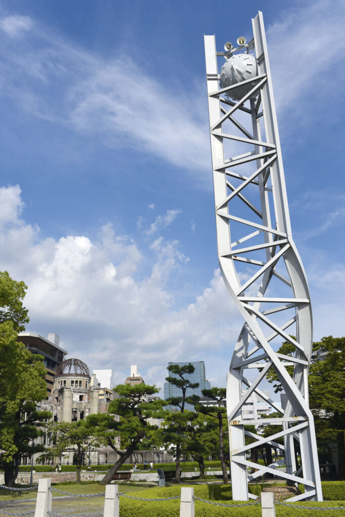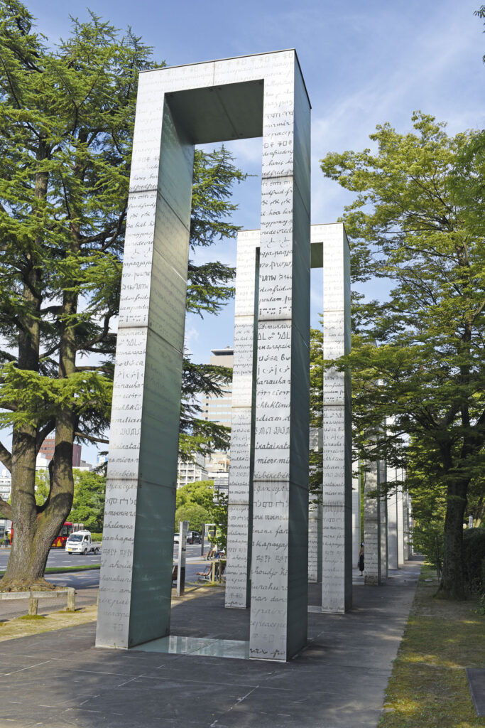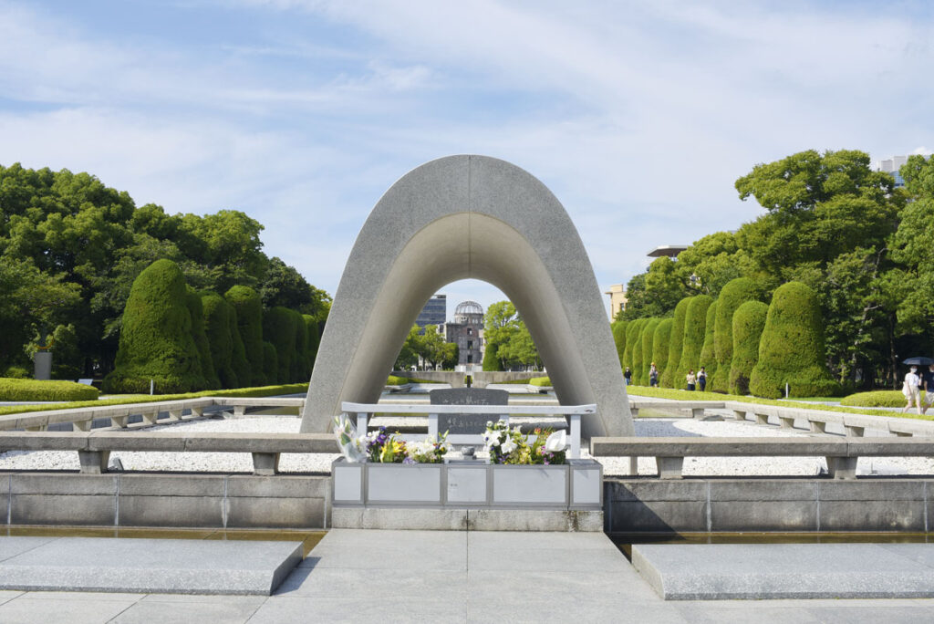 Kenzō Tangen suunnitteleman Hiroshiman rauhanpuiston merkitys kiteytyy kenotafiin, jonka keskipisteessä näkyy atomipommikupoliksi kutsuttu rauhanmuistomerkki. Kaari suojelee kuolleita sieluja, vesi solisee juotavaa kaivanneille.