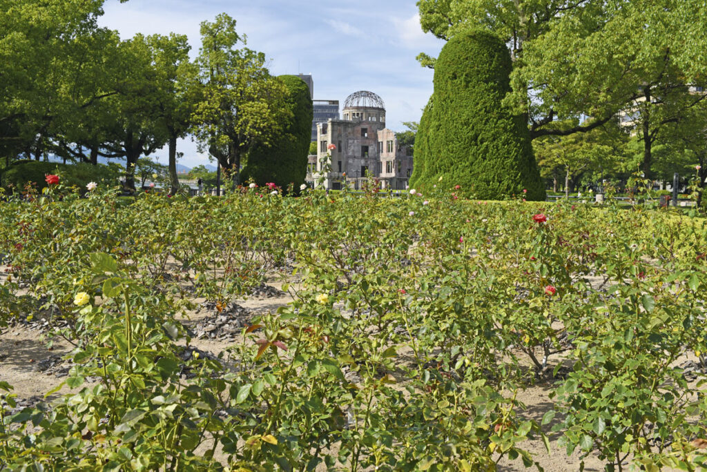 Hiroshiman rauhanpuiston ruusutarha on saanut lahjoituksia eri puolilta maailmaa. Kauneimmillaan ruusut ovat toukokuussa.