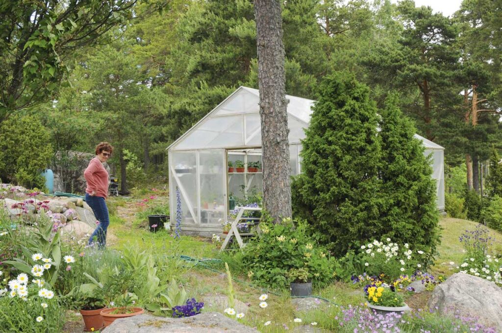 Lola kasvattaa lähes kaikki kesäkukat siemenestä, sillä kaupan taimet olisivat sekä kalliita että hankalia rahdata saarelle. Kesäkukkia on niin maassa kuin ruukuissakin, kivien päällä. Piharinteessä seisova kasvihuone on suunnaton apu, sillä sinne saadaan varhainen kevät. Kasvihuoneesta nostetaan myös kesän ensimmäinen perunasato. Sen jälkeen alkaa alhaalla pellolla oleva perunamaa tuottaa syötävää ja kasvihuoneessa on tomaattien vuoro.