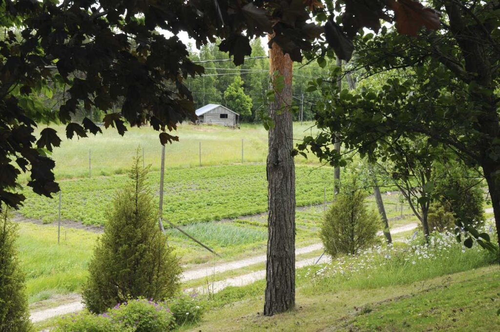 Kasvimaa on aidattu tiiviisti korkealla riista-aidalla kauriiden takia. Ilman aitaa ei kasvimaalta saa satoa, sillä kauriit ahmivat perunoiden naatit ja kaivavat porkkanat maasta.