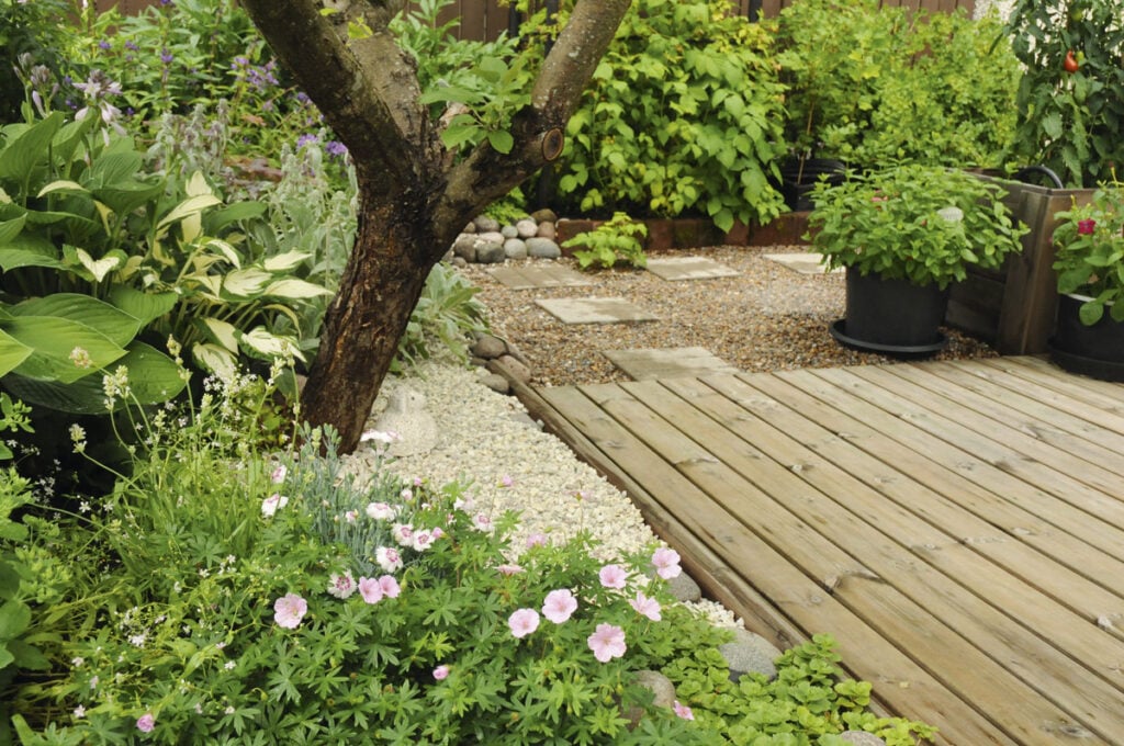 – Tämä on niin varjoinen kohta, että nurmi tai maanpeitekasvillisuus ei viihtynyt ollenkaan. Lisäksi terassin päällä on hyvä, tasainen pinta isolle ruokailuryhmälle.