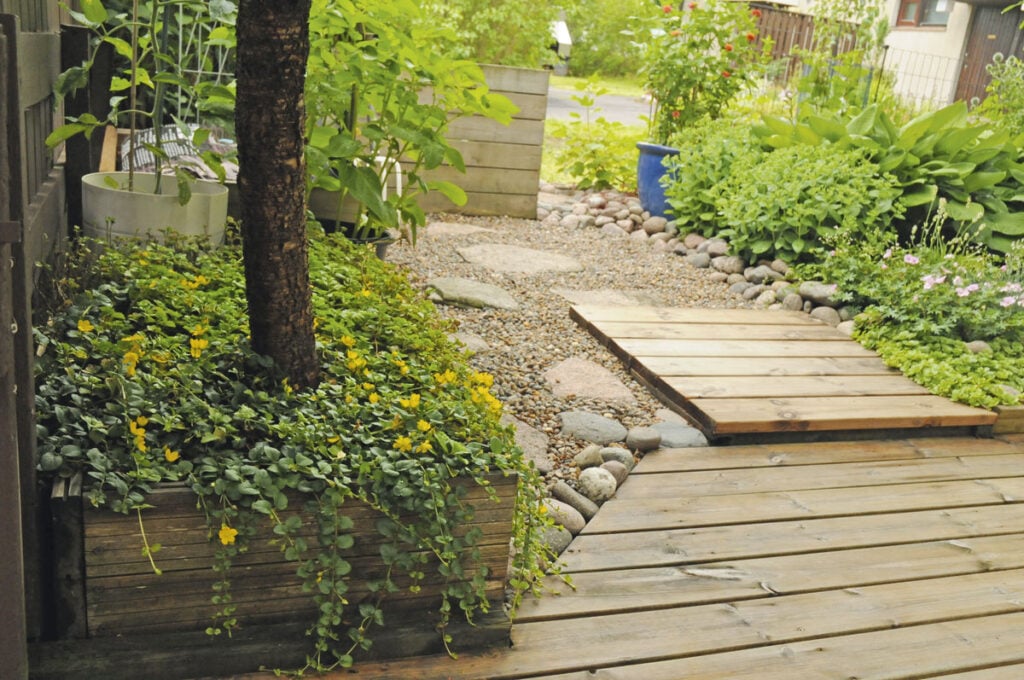 Kirsikkalaatikon pintaa peittää suikeroalpi (Lysimachia nummularia), joka ryöppyää rentona reunan yli. Käytävän toisella puolella viihtyvät maksaruohot (Sedum).