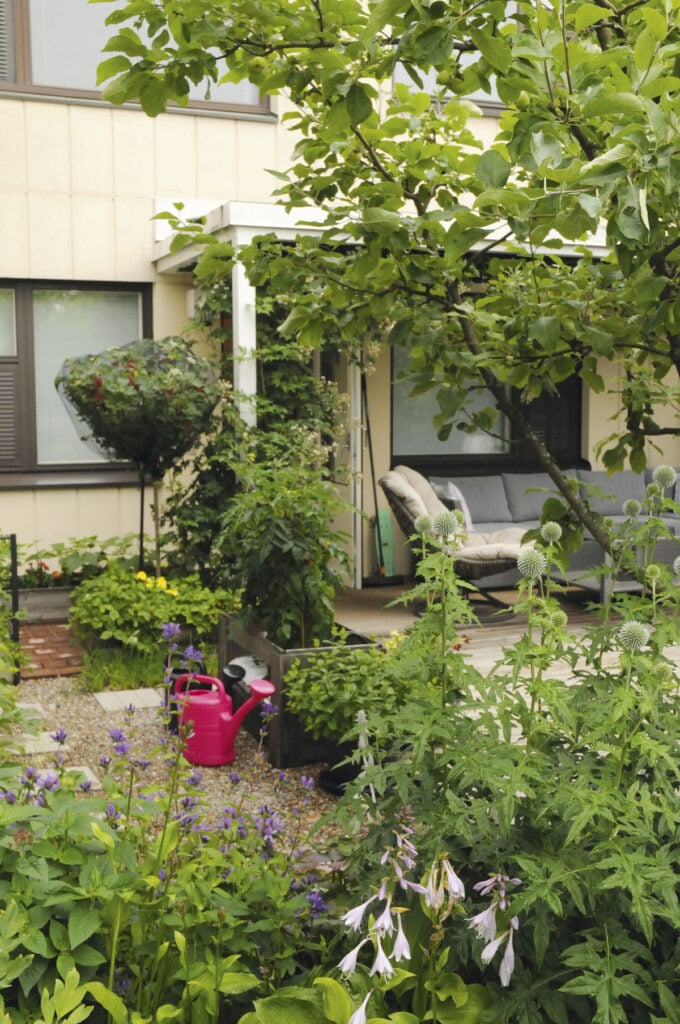 Postimerkkipihaan mahtuu omaa ruuantuotantoa, itse kasvatettuja perennoja, komposti ja tilava terassi. Kasvit saavat mielellään olla sekä kauniita että syötäviä.