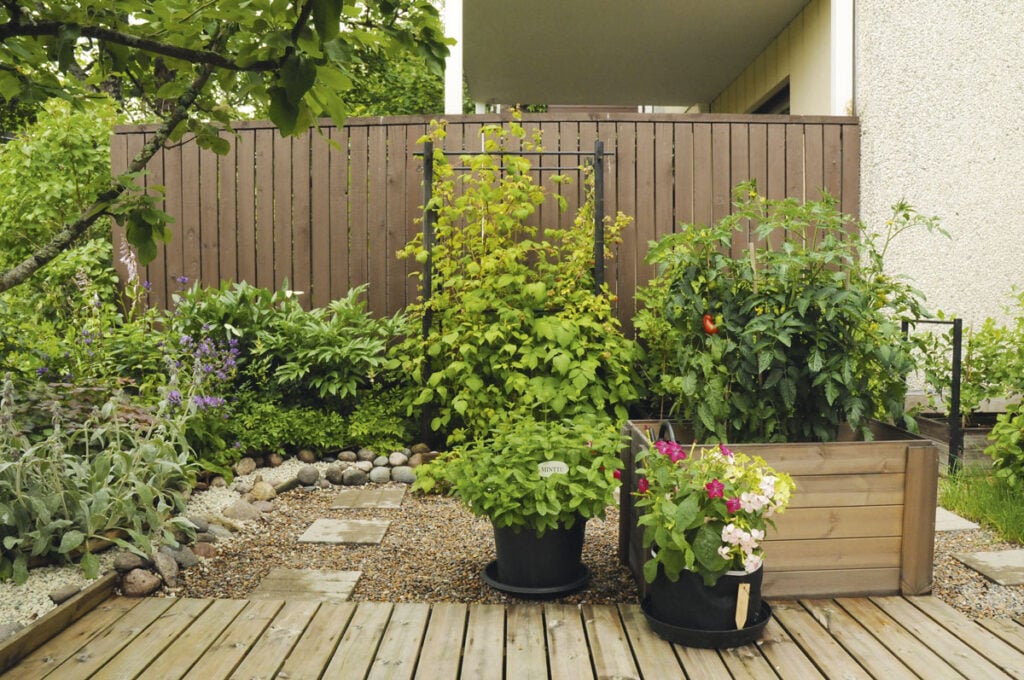 Johanna haluaa, että samaan laatikkoon mahtuu yrttejä ja kukkiakin. Siinä kasvaa myös rungollinen punaherukka – loistovalinta, kun tilaa on vähän. Tyvelle mahtuu muita kasveja.
