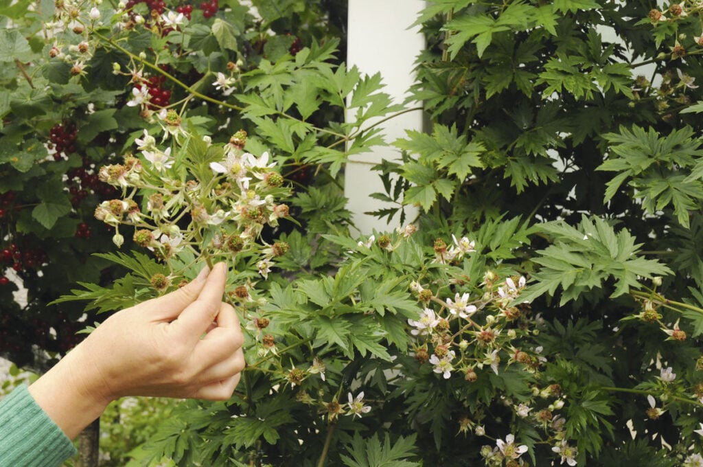 Terassin kulman suuressa viljelylaatikossa, jossa ei ole pohjaa vaan yhteys suoraan maahan, kasvaa liuskavatukka 'Thornless Evergreen' (Rubus laciniatus). Sen Johanna ottaa talveksi alas ja käärii rullalle pakkasharson alle.